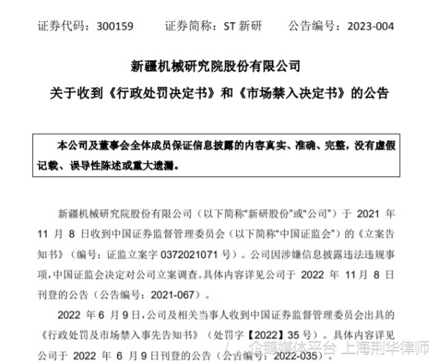 2023年1月19日,新疆机械研究院股份有限公司(ST新研,300159)发布收到《行政处罚决定书》和《市场禁入决定书》的公告。中国证监会决定:一、责令新研股份公司改正其违法行为,对其给予警告,并处以三百万元罚款;二、对韩华给予警告,并处以三百万元的罚款;三、对匡理鹏给予警告,并处以五十万元的罚款。