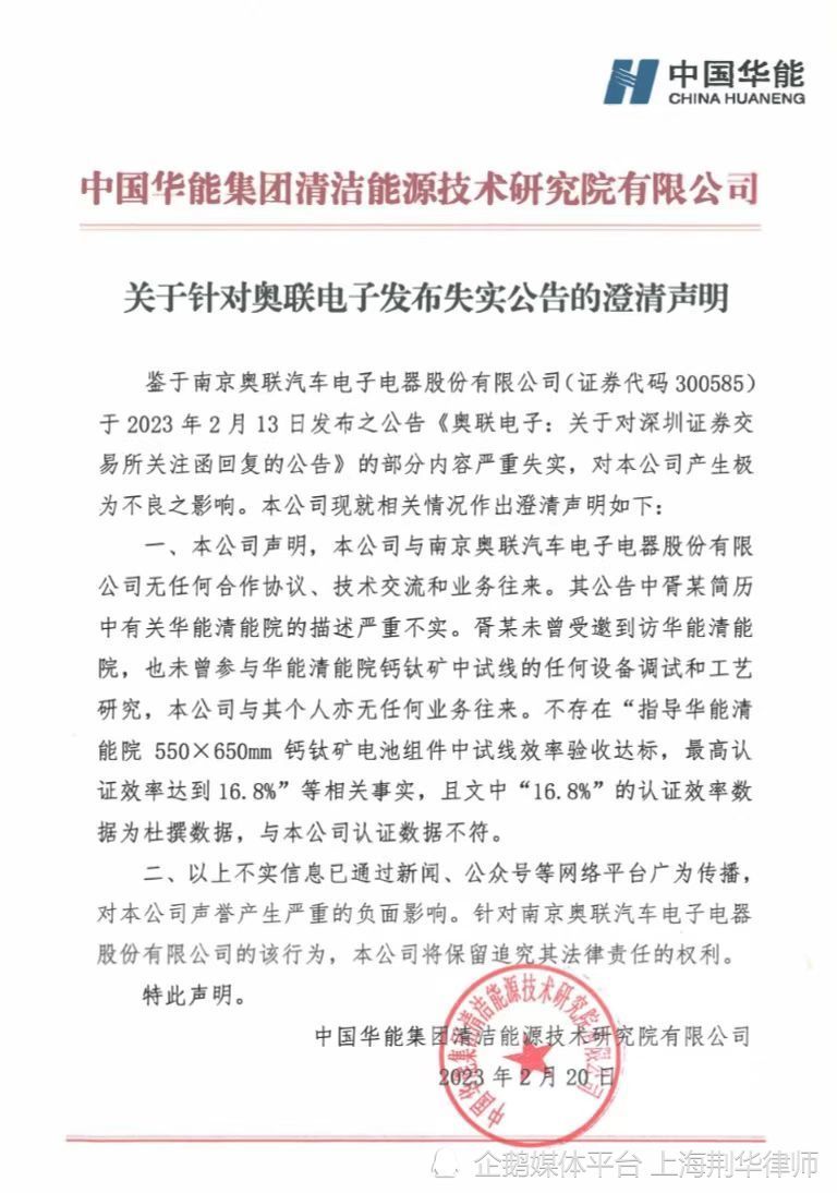 2022年2月21日,华能清洁能源研究院发布一则澄清声明称,公司与南京奥联电子公司无合作关系,技术交流和业务往来,公告中胥某简历与华能清能院的描述严重不实,公司并保留追究其法律责任的权利。