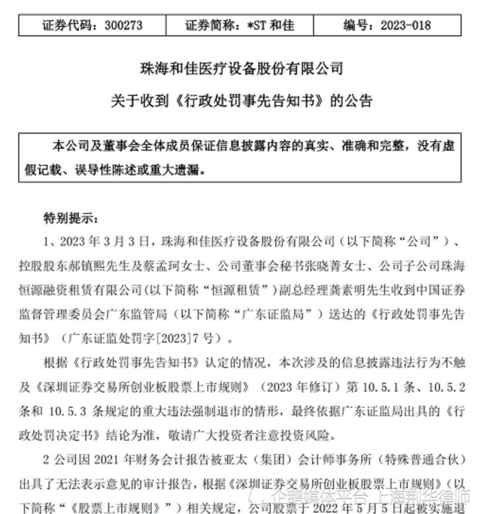 2023年3月6日,*ST和佳发布公司收到《行政处罚事先告知书》的公告:2023年3月3日,珠海和佳医疗设备股份有限公司、控股股东郝镇熙先生及蔡孟珂女士、公司董事会秘书张晓菁女士、公司子公司珠海恒源融资租赁有限公司副总经理龚素明先生收到中国证券监督管理委员会广东监管局送达的《行政处罚事先告知书》(广东证监处罚字[2023]7号)。