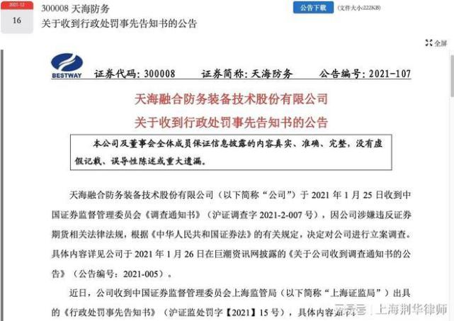 2022年8月2日晚间,天海融合防务装备技术股份有限公司(证券简称:天海防务,证券代码:300008)公告称收到中国证券监督管理委员会上海监管局出具的《行政处罚决定书》(沪202216号)。中国证监会决定:对天海防务责令改正,给予警告,并处以四十万元罚款。