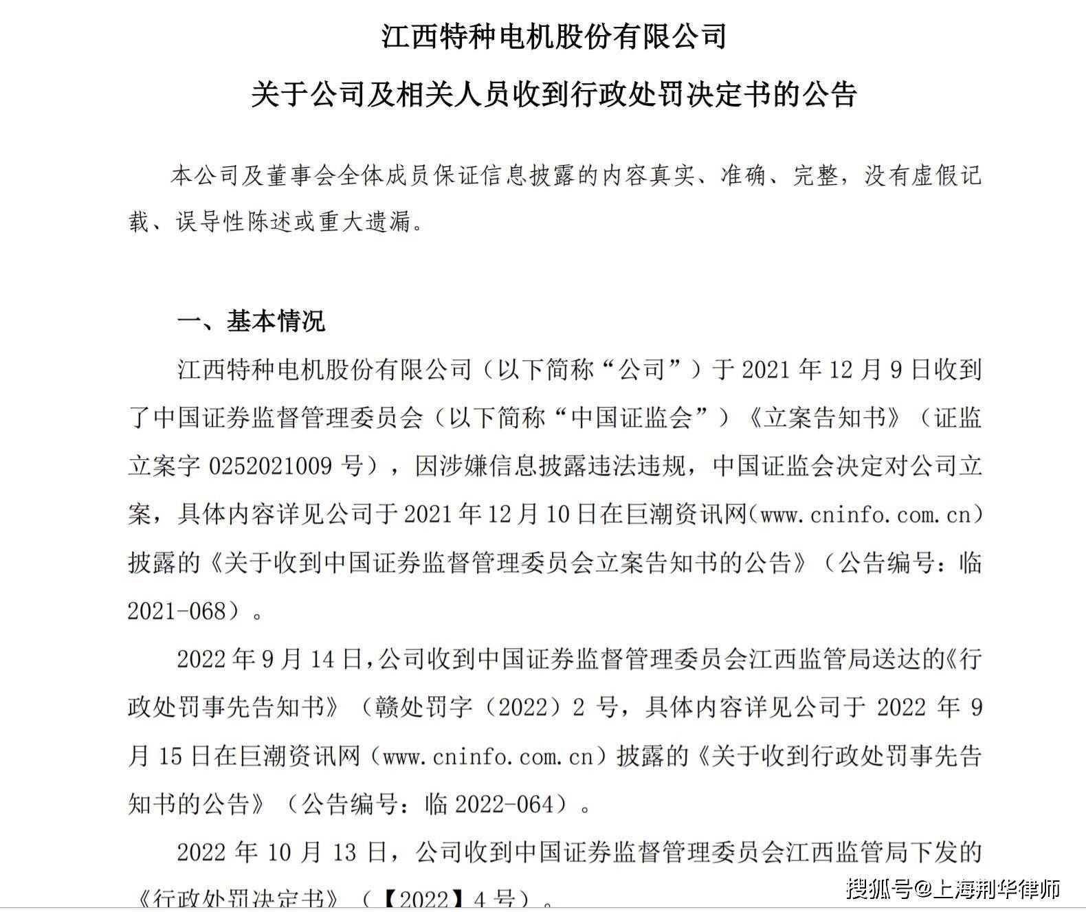 政处罚事先告知书》。2022年10月14日,公司发布公告称,2022年10月13日,公司已收到中国证监会江西监管局下发的《行政处罚决定书》(【2022】4号)。经证监会查明,2017至2018年期间,江特电机间接控股子公司宜春银锂通过与其相关客户开展无实物流转的虚构交易,虚增营业收入、存货和利润。